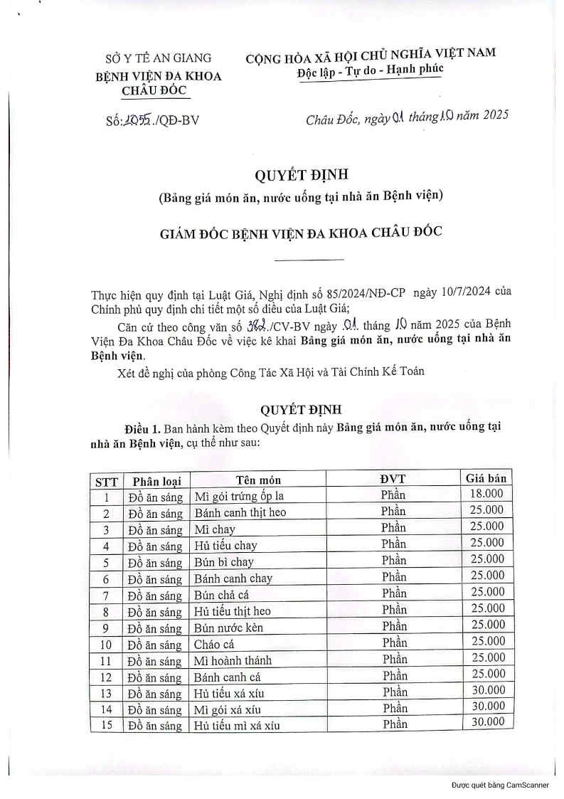 BẢNG GIÁ CÁC MÓN ĂN TẠI CĂN TIN 01/10/2025 02/10/2025 81 Dịch Vụ Kỹ Thuật & Viện Phí Share Bảng giá - Công văn bảng kê khai mức giá. >>>Xem chi tiết. - Bảng giá món ăn, nước uống tại nhà ăn nhân viên. >>>Xem chi tiết. TAGS: bảng giá các món ăn tại căn tin 01 10 2025 bang gia cac mon an tai can tin 01 10 2025