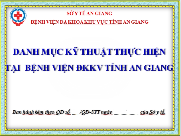 Sở Y tế An Giang ban hành quyết định số 1508/QĐ-SYT, ngày 30/11/2017 về việc phê duyệt bổ sung Danh mục kỹ thuật (theo Thông tư số 43/2013TT-BYT ngày 11/12/2013, và Thông tư số 21/2017/TT-BYT ngày 10/05/2017 của Bộ Y Tế quy định chi tiết phân tuyến chuyên môn kỹ thuật đối với hệ thống cơ sở khám bệnh chữa bệnh) thực hiện tại Bệnh viện Đa Khoa Khu Vực Tỉnh An Giang.