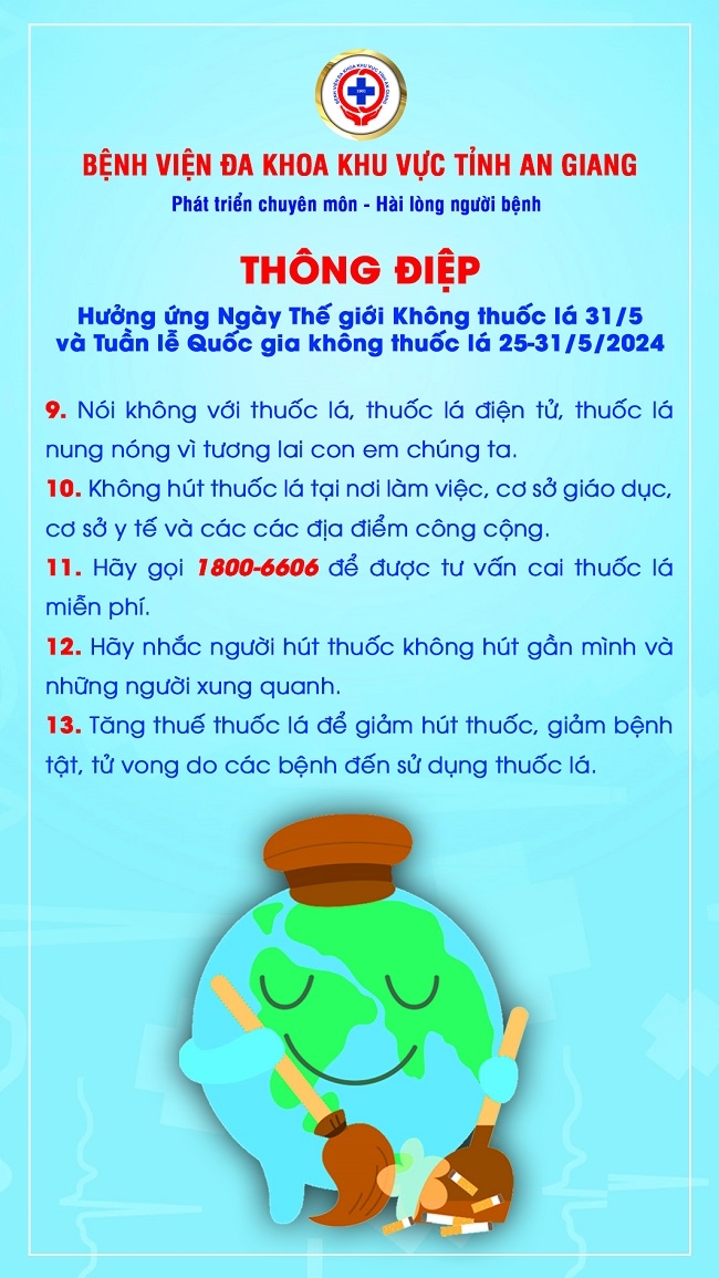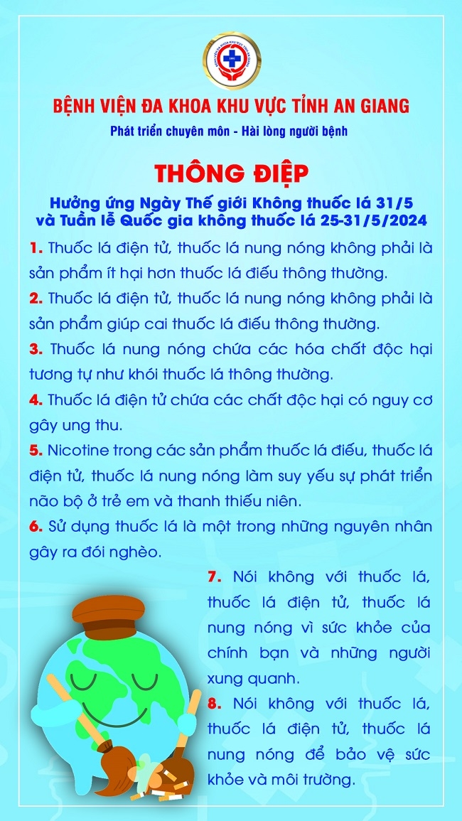 Nhằm thông tin đến cộng đồng tác hại của thuốc lá tới môi trường, Ngày Thế giới không thuốc lá năm nay với thông điệp được Tổ chức Y tế thế giới lựa chọn: “Bảo vệ trẻ em trước những tác động của ngành công nghiệp thuốc lá”. Bệnh viện Đa Khoa khu vực tỉnh An Giang xin gửi đến thông điệp hưởng ứng Ngày Thế giới không thuốc lá 31/5 và Tuần lễ Quốc gia không thuốc lá 25-31/5/2024.