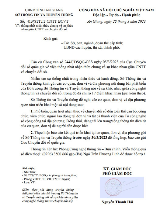 Toàn văn bài phát biểu của Bộ trưởng Nguyễn Mạnh Hùng nói về sự khác nhau giữa công nghệ thông tin và chuyển đổi số đã được đăng tải trên Cổng Thông tin điện tử Bộ Thông tin và Truyền thông: TẠI ĐÂY