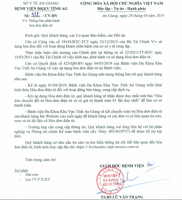 Thông Báo Về Việc Phát Hành Hoá Đơn Điện Tử Tại Bệnh Viện ĐKKV Tỉnh An Giang