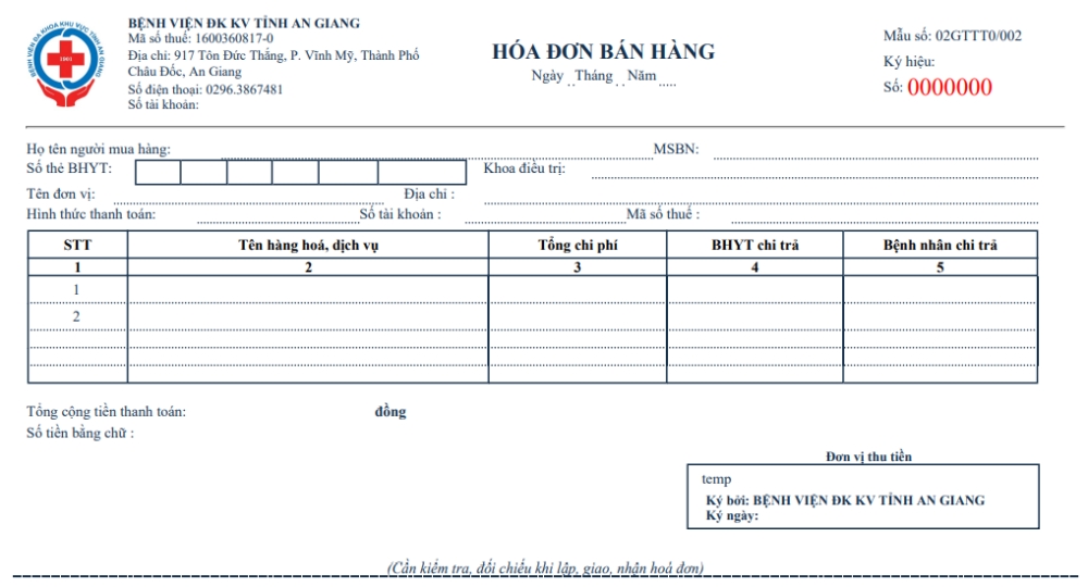 Từ ngày 01/04/2019, Bệnh viện ĐKKV tỉnh An Giang triển khai hình thức Hóa đơn điện tử đối với hoạt động bán hàng, cung cấp dịch vụ. Khi áp dụng Hóa đơn điện tử, quý khách hàng sẽ nhận được duy nhất một bản “Hóa đơn chuyển đổi từ Hóa đơn điện tử và có giá trị thanh toán 01 lần duy nhất” để làm cơ sở thanh toán.