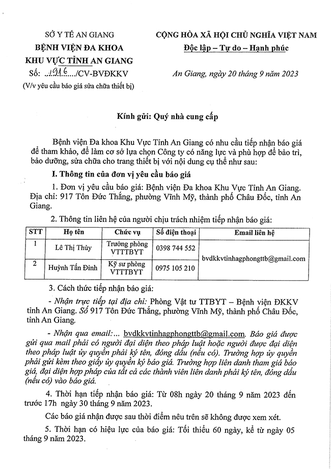 THƯ MỜI BÁO GIÁ SỬA CHỮA THIẾT BỊ T09.2023 20/09/2023 21 Thông Tin Mời Thầu & Danh Mục VTYT Share THƯ MỜI BÁO GIÁ SỬA CHỮA THIẾT BỊ T09.2023 TAGS: trung tâm xét nghiệm trung tam xet nghiem THƯ MỜI BÁO GIÁ SỬA CHỮA THIẾT BỊ T09 2023 thu moi bao gia sua chua thiet bi t09 2023