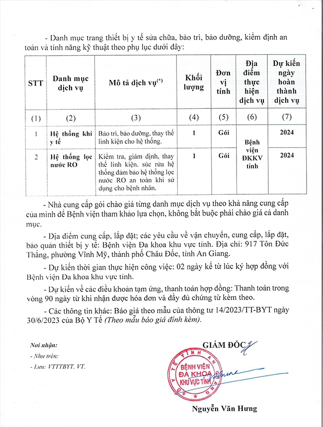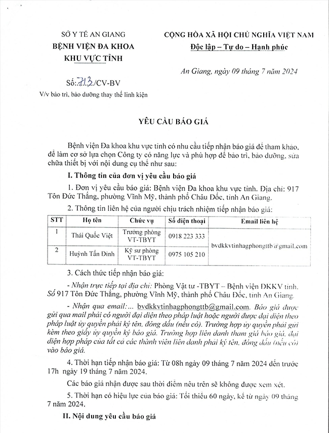 THƯ MỜI CHÀO GIÁ BẢO TRÌ, BẢO DƯỠNG LINH KIỆN THÁNG 07 NĂM 2024