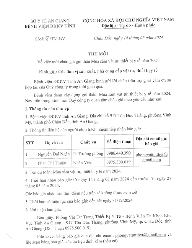 Thư mời chào giá gói thầu Mua sắm vật tư, thiết bị y tế T05 năm 2024 14/05/2024 49 Thông Tin Mời Thầu & Danh Mục VTYT Share Thư mời chào giá gói thầu Mua sắm vật tư, thiết bị y tế T05 năm 2024 Mẫu báo giá Danh mục mua sắm thêm T05 (Lần 2) 2024 TAGS: trung tâm xét nghiệm trung tam xet nghiem Thư mời chào giá gói thầu Mua sắm vật tư thiết bị y tế T05 năm 2024 thu moi chao gia goi thau mua sam vat tu thiet bi y te t05 nam 2024