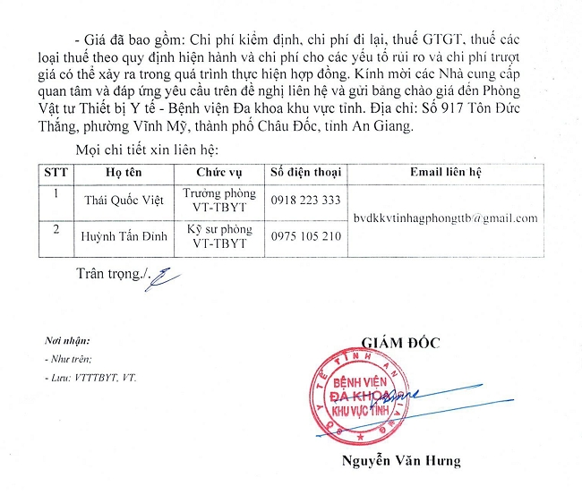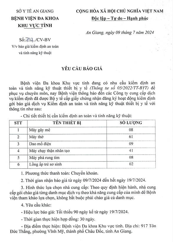 THƯ MỜI CHÀO GIÁ KIỂM ĐỊNH AN TOÀN VÀ TÍNH NĂNG KỸ THUẬT THÁNG 07 NĂM 2024