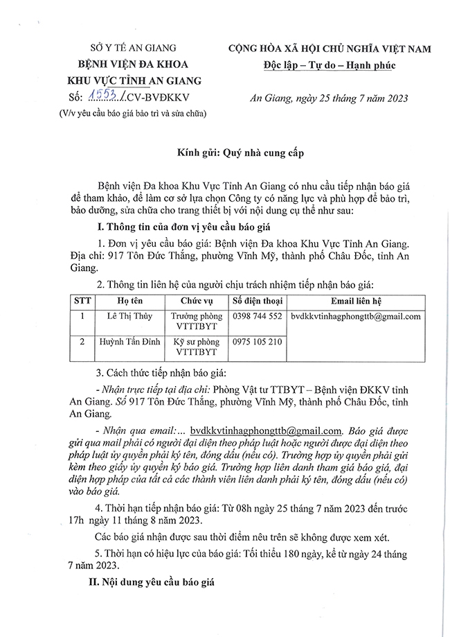 Thư mời chào giá về việc bảo trì,bảo dưỡng,sửa chữa cho trang thiết bị 25/07/2023 50 Thông Tin Mời Thầu & Danh Mục VTYT Share Thư mời chào giá về việc bảo trì,bảo dưỡng,sửa chữa cho trang thiết bị Chi tiết: Yêu cầu báo giá bảo trì thiết bị và sửa chữa Yêu cầu báo giá bảo trì thiết bị CV1594 CV1595 TAGS: trung tâm xét nghiệm trung tam xet nghiem Thư mời chào giá về việc bảo trì bảo dưỡng sửa chữa cho trang thiết bị thu moi chao gia ve viec bao tribao duongsua chua cho trang thiet bi